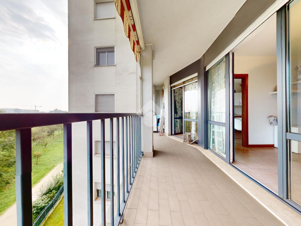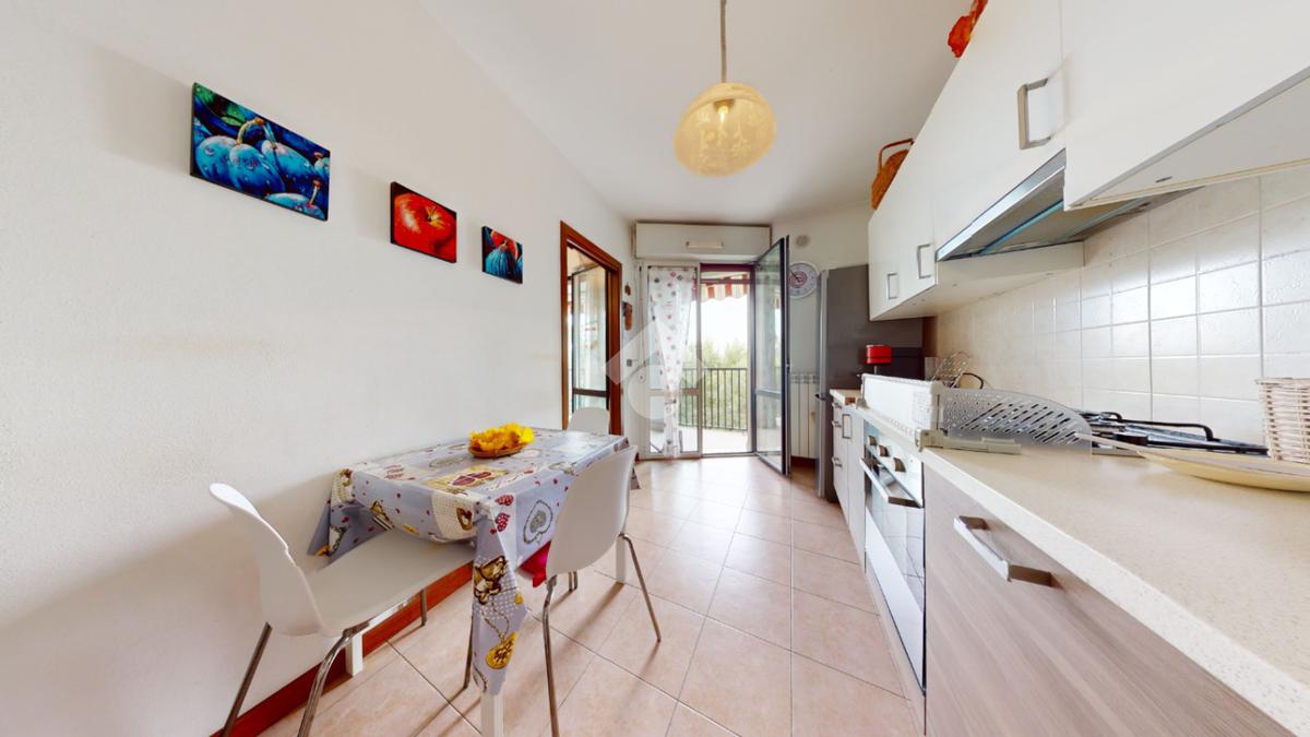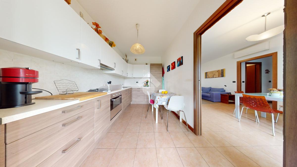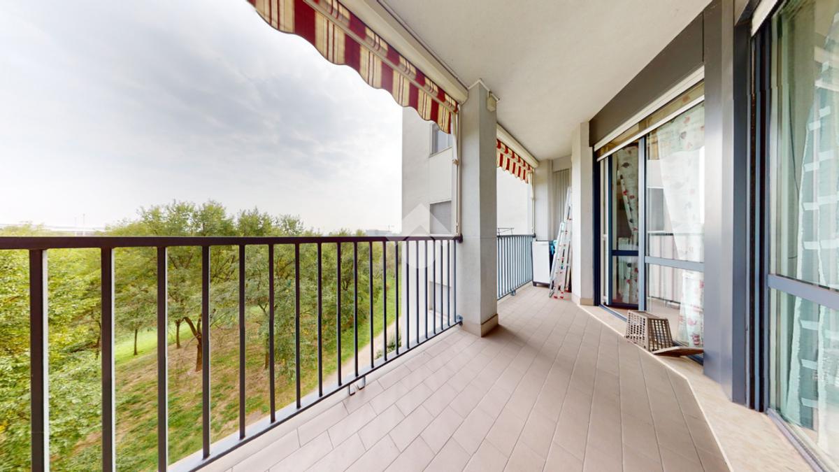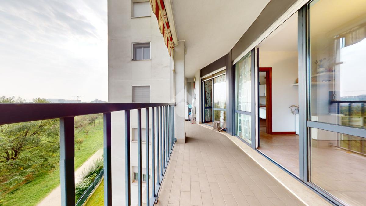 La cucina è separata. Da qui si accede al terrazzo vivibile comunicante con la zona giorno, con affaccio sul parco della Lambretta.