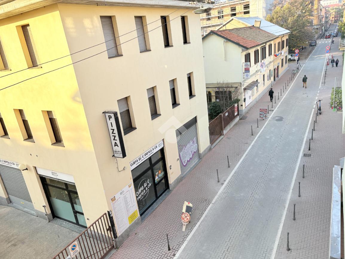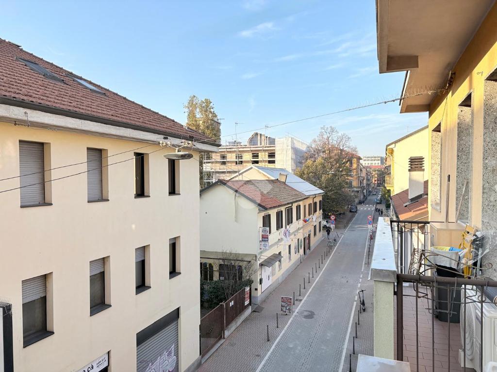 La zona giorno comprende la cucina completa di elettrodomestici, il tavolo da pranzo, il divano e la tv. Da qui si accede al balcone che dona una piacevole vista sull'iconica via Conte Rosso, attivo cuore pulsante del quartiere di Lambrate, e su via Saccardo.