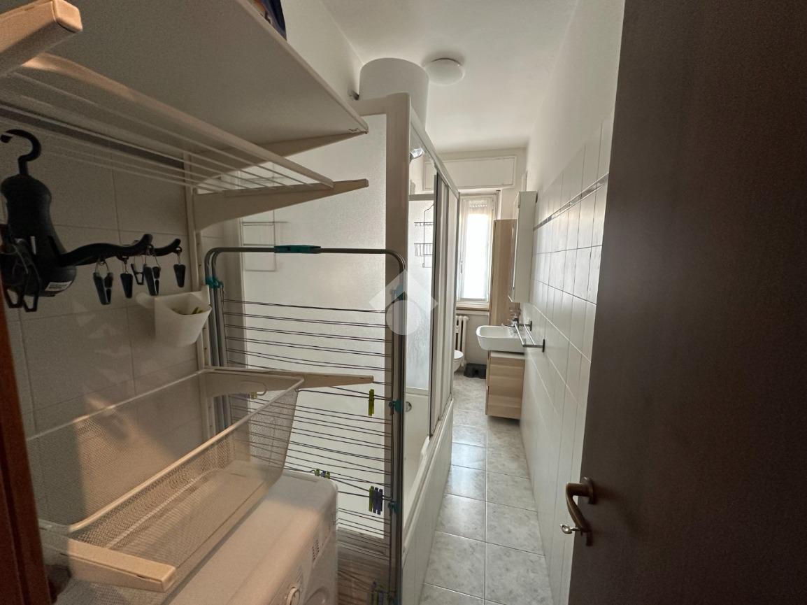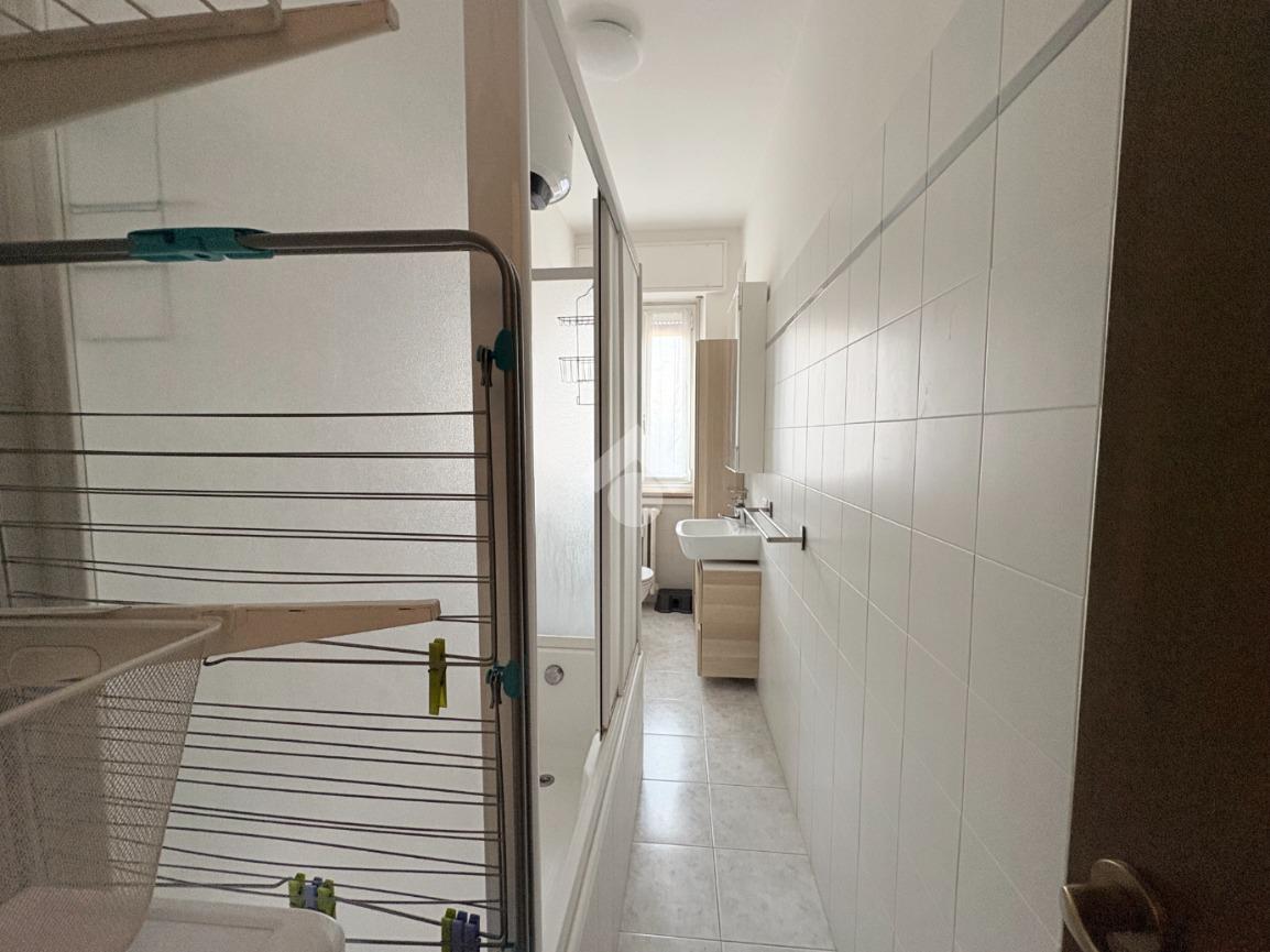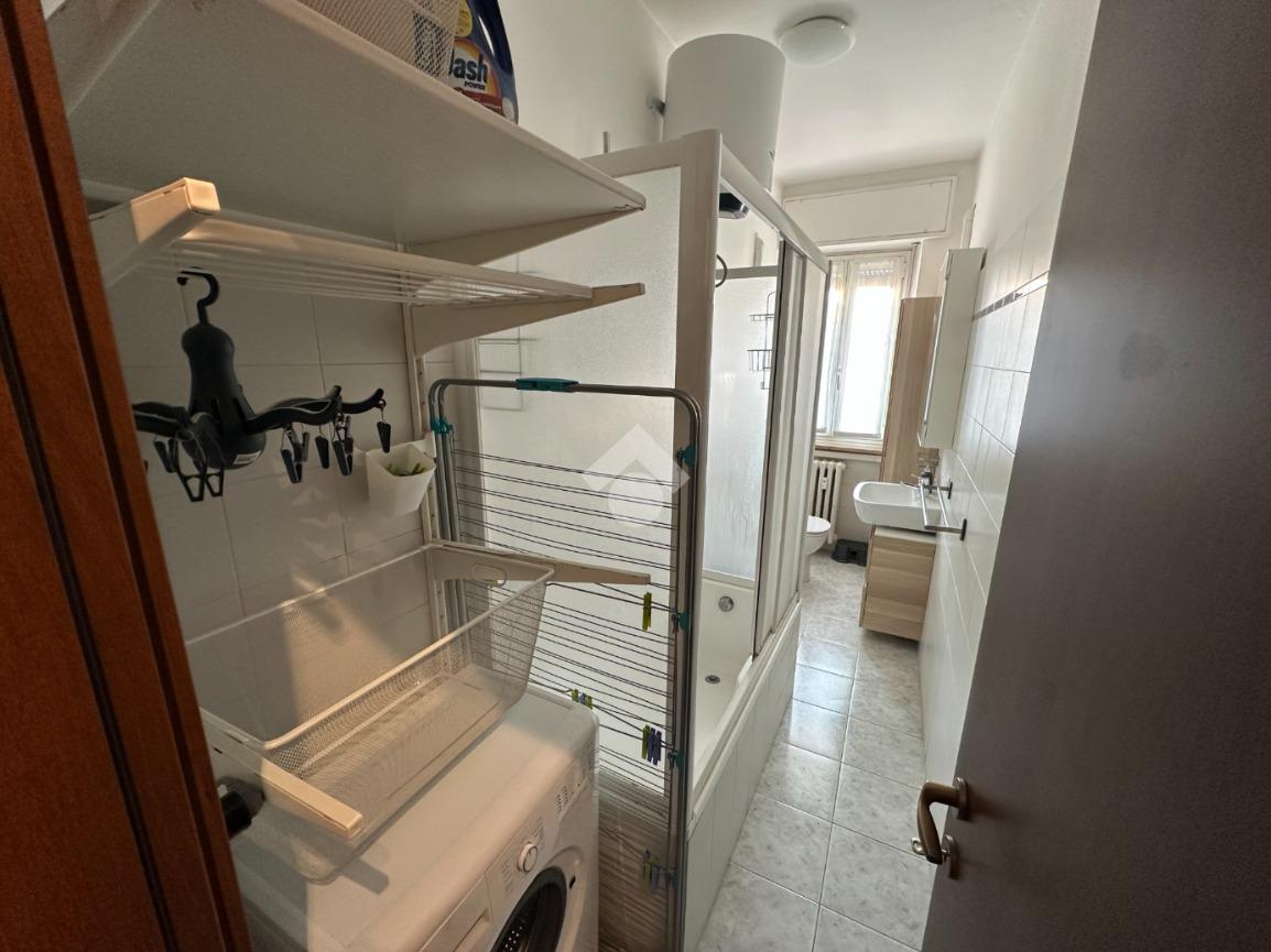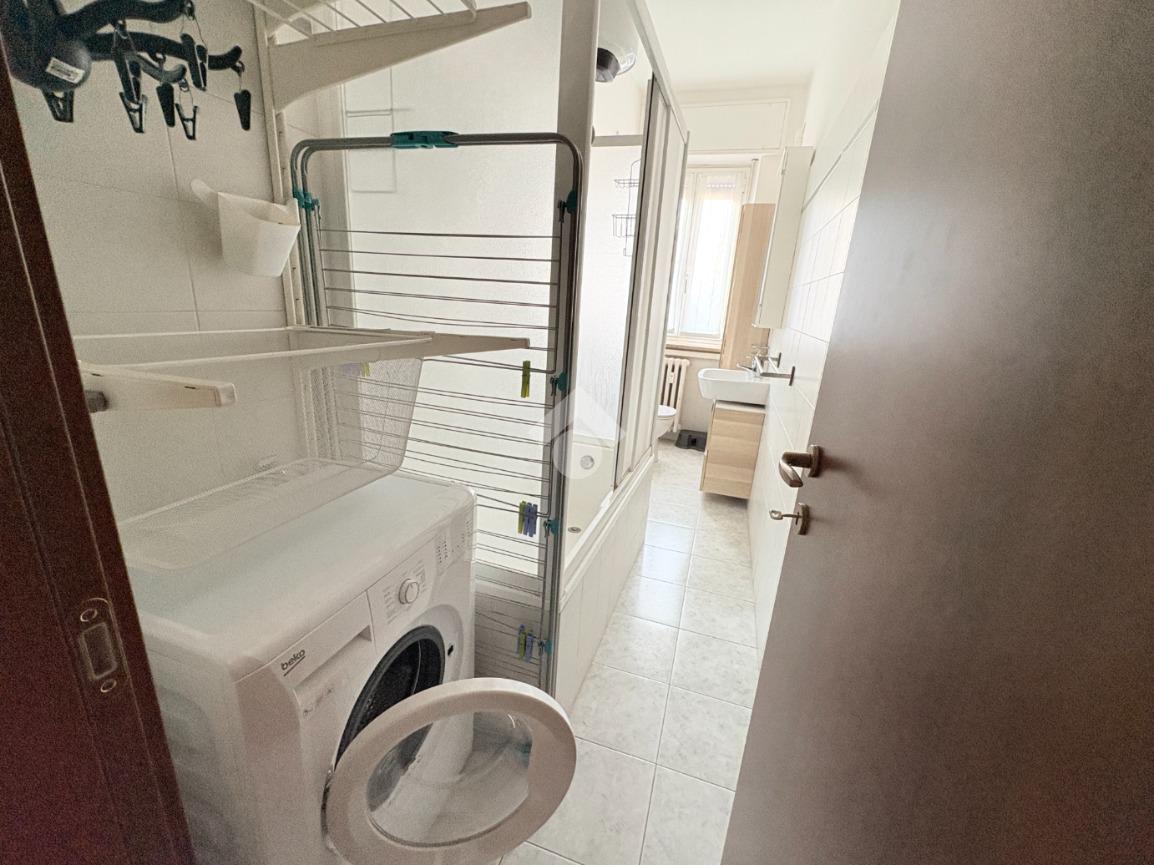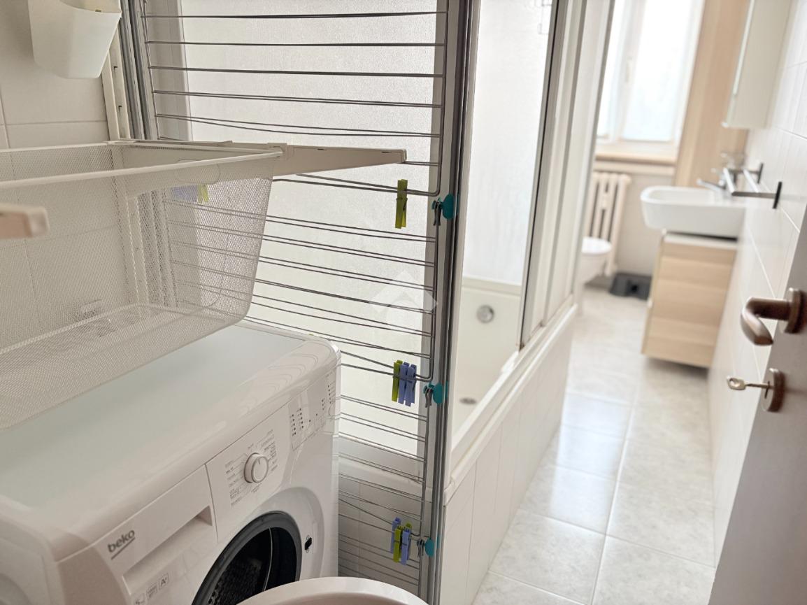 Il bagno, finestrato, è ben organizzato con una zona dedicata come lavanderia, con la lavatrice, stendibiancheria e contenitori per il bucato; la vasca da bagno è dotata di pareti doccia.