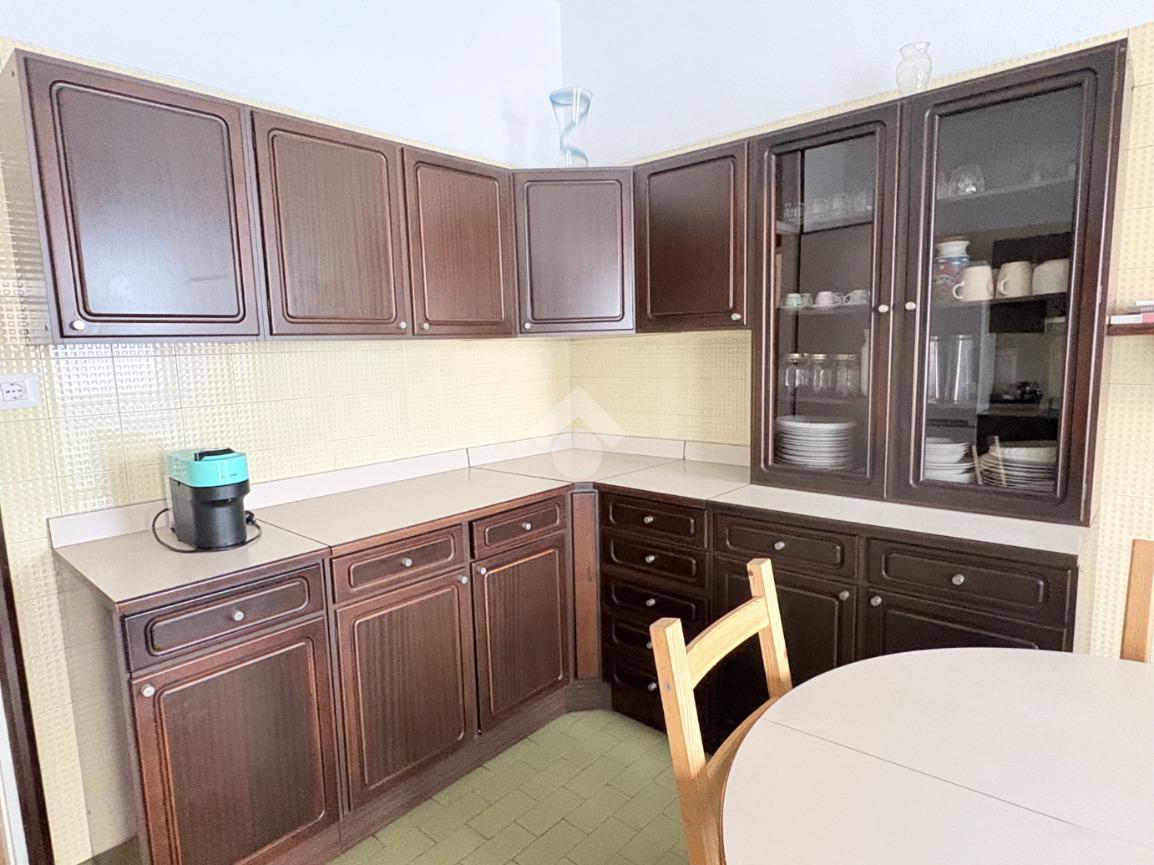 Il soggiorno/cucina arredato con mobili capienti. La dotazione degli elettrodomestici comprende frigorifero, lavastoviglie, forno e piano ad induzione. Trova posto anche il tavolo da pranzo e una zona con un divano.