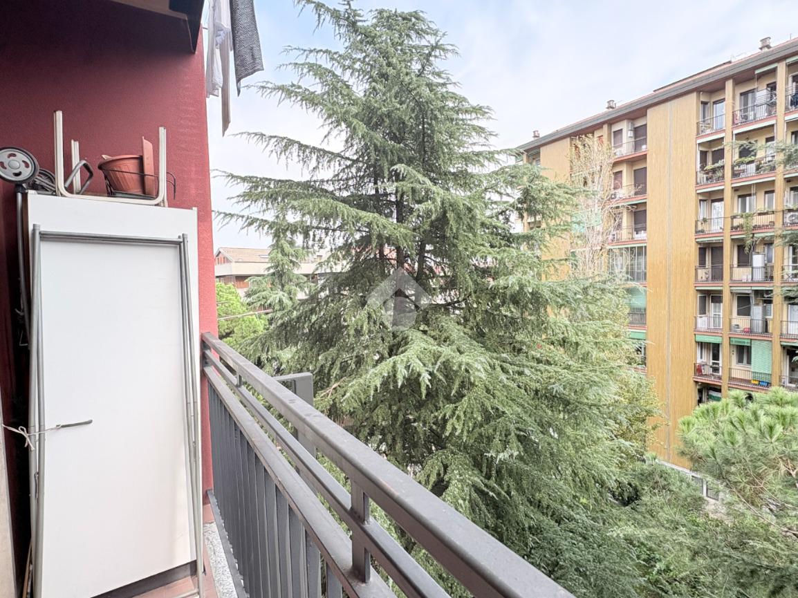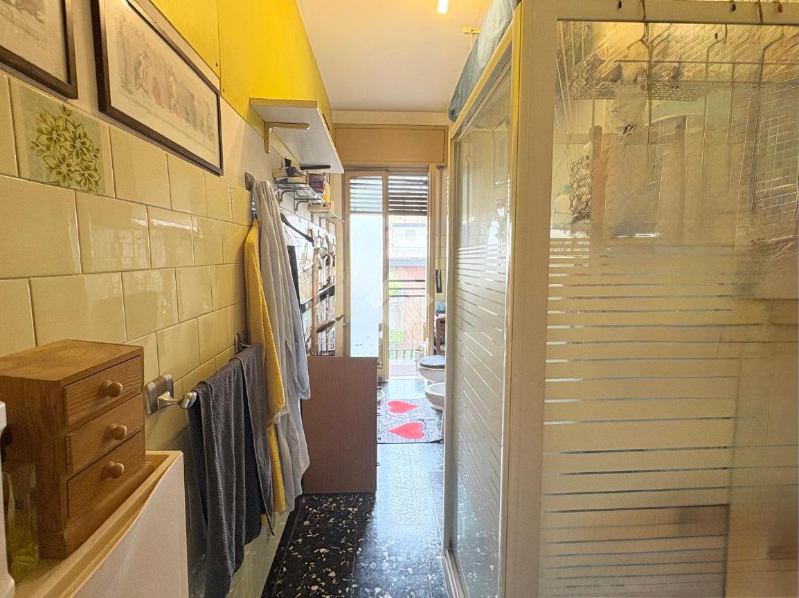 Il bagno è dotato di tutti gli elementi, è presente la doccia e accede al secondo balcone rivolto verso il cortile d'ingresso su via Muzio Scevola.