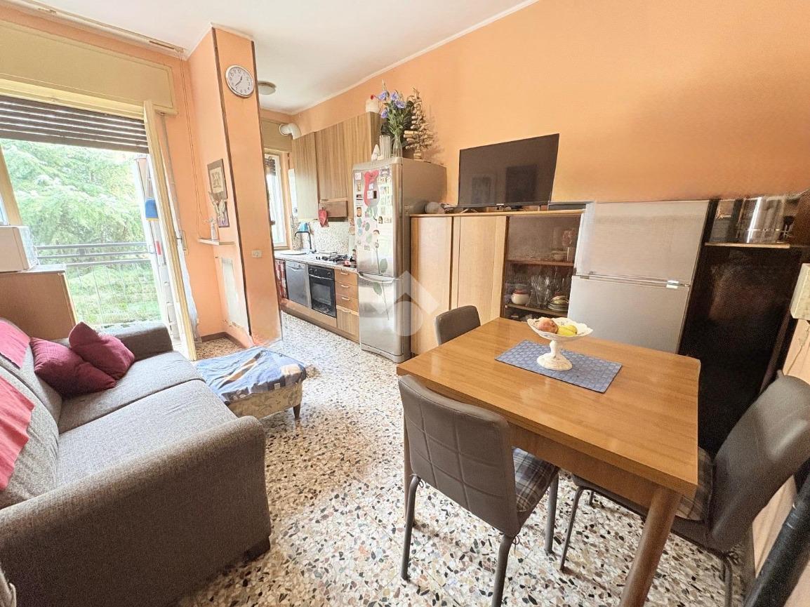 La zona giorno ospita il divano e il tavolo da pranzo; da qui si accede al primo balcone con affaccio tranquillo e silenzioso sul verde sottostante.