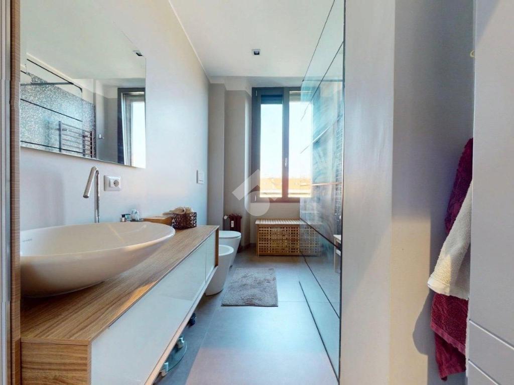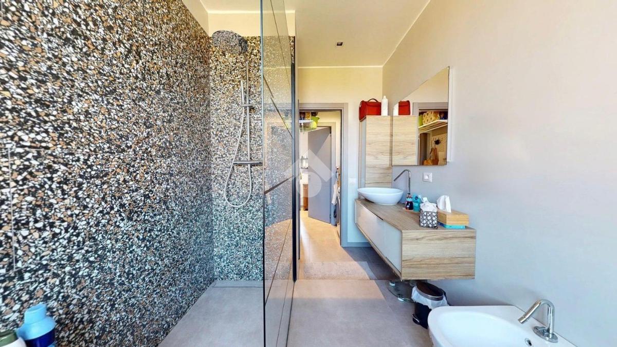 Il bagno è moderno, con doccia walk-in e arredo su misura.