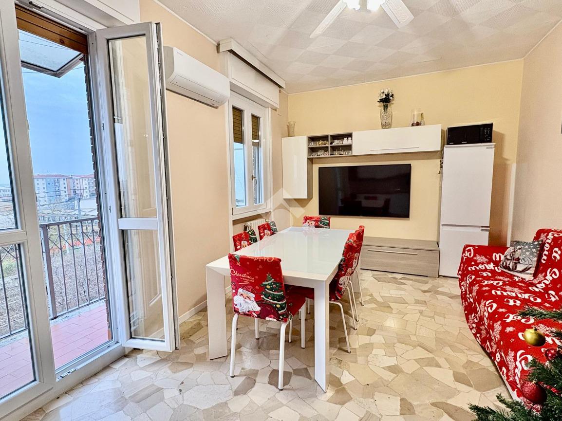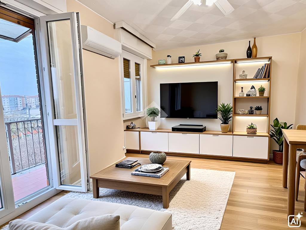 La zona living, di pianta regolare, è costituita da un soggiorno con il relativo arredo, il divano e dalla cucina con tavolo da pranzo. Da qui si accede al lungo balcone che percorre l'intera lunghezza dell'appartamento.