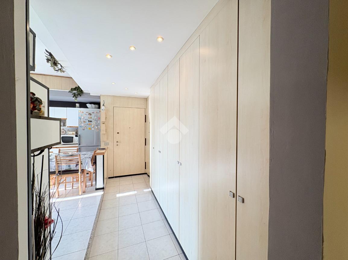 Il corridoio d'ingresso, ribassato e ben illuminato dai feretti, ospita un ampio arredo su misura utile per creare ordine e spazio.