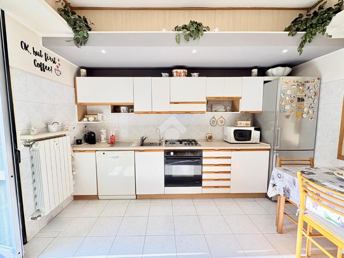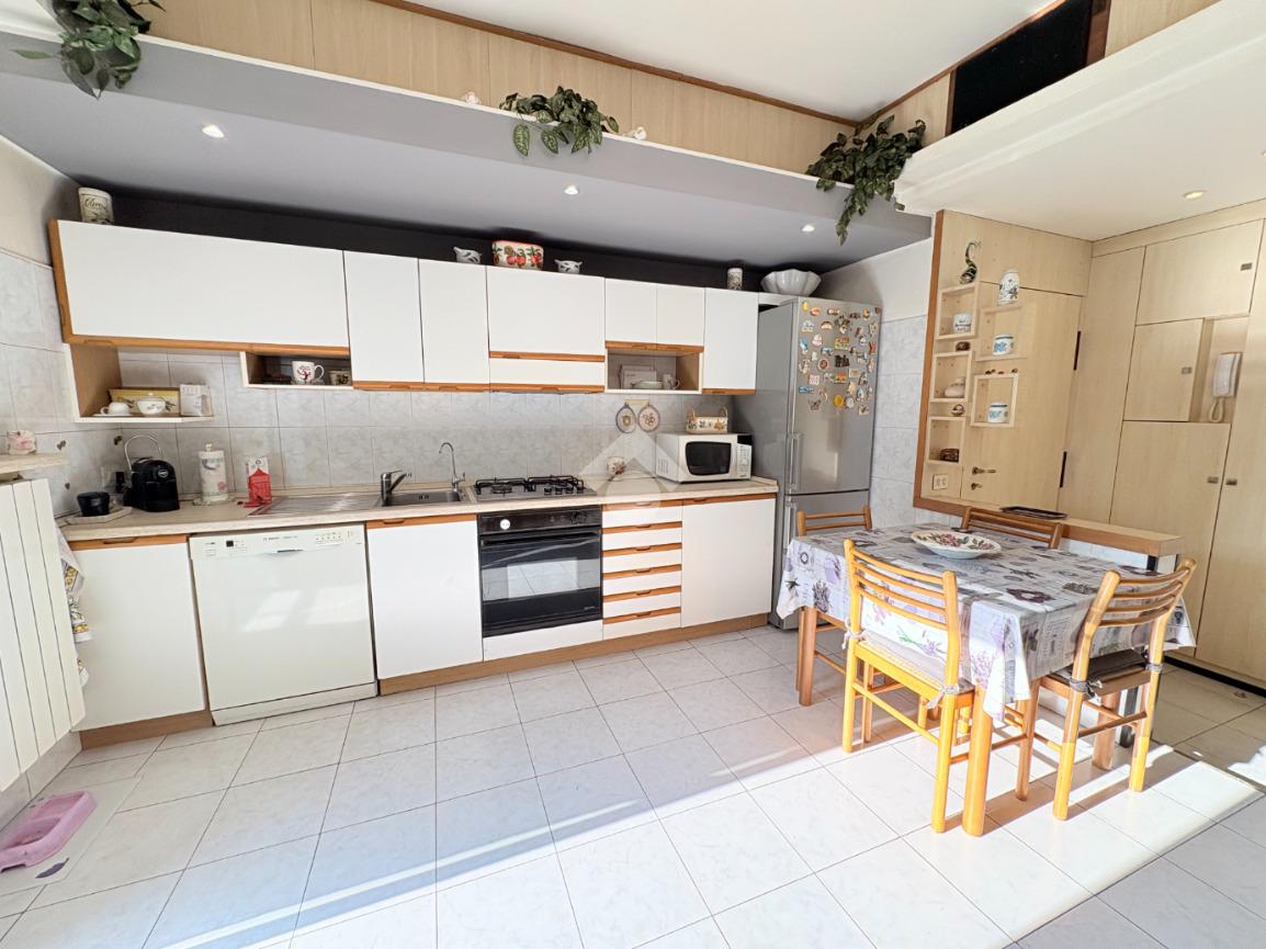 Il soggiorno è molto luminoso e accogliente. La cucina si sviluppa lungo una parete e frontalmente ad essa si trova il tavolo da pranzo.