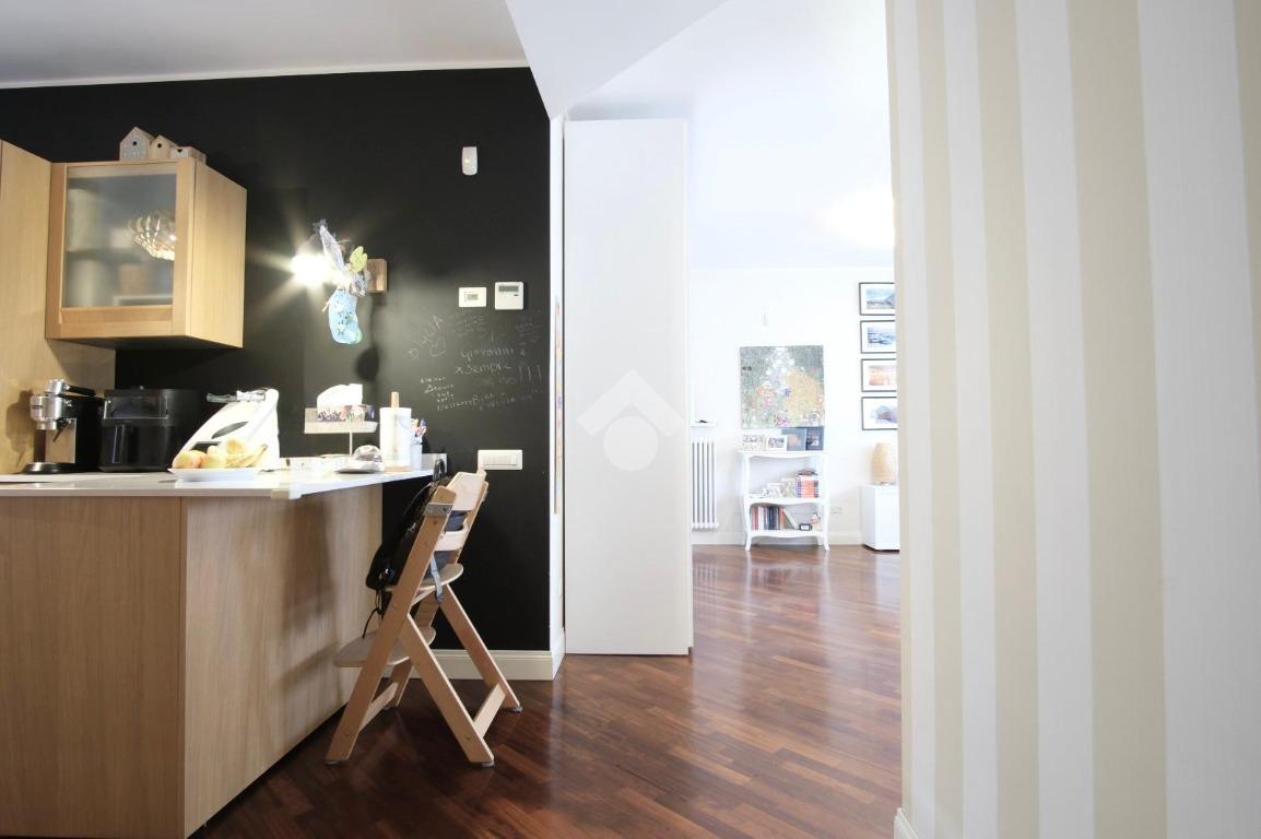La porta d'ingresso si apre sul soggiorno, molto luminoso grazie alla presenza di tre serramenti. La pianta molto razionale di tipo open space è molto conviviale e permette un'ottima divisione degli spazi, definendo la zona tv con il divano, la zona pranzo e la cucina. Quest'ultima è dotata anche di una penisola e di ampi spazi d'appoggio.